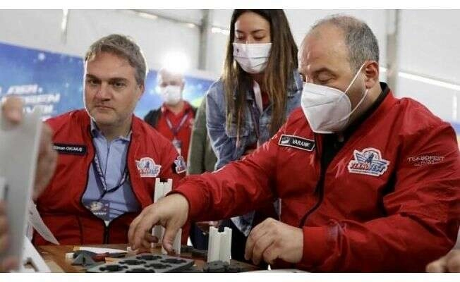 Burada, "Roketimi Tasarlıyorum" atölyesi ve roket yarışması sergi alanı hakkında Okumuş'tan bilgi alan Varank, atölyede gençlerle birlikte roket tasarladı.