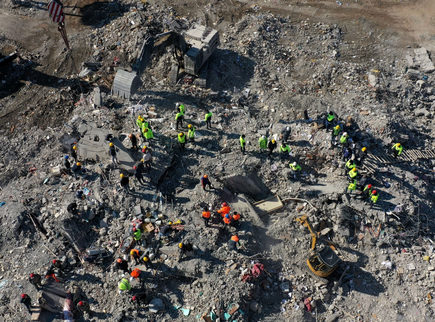 'Asrın felaketi' olarak nitelenen Kahramanmaraş merkezli depremlerin büyük yıkıma yol açtığı Hatay'ın İskenderun ilçesinde Cengiz Topel Caddesi üzerinde bulunan Eda Apartmanı enkazında arama kurtarma ekiplerin çalışması devam etti