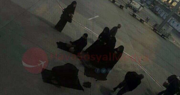 İstanbul Sabiha Gökçen Havalimanında apronda namaz kılan grubu bekleyen Trabzon uçağı rötar yaptı.