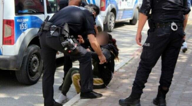 Elinde bıçakla eşini kolundan çeken Hüseyin Ç.'nin etrafını polis ekipleri çevirdi. Muratpaşa İlçe Emniyet Müdürlüğü ekipleri, bir anlık dalgınlığından faydalandığı saldırganın elinden bıçağı aldı ve kadını kurtardı