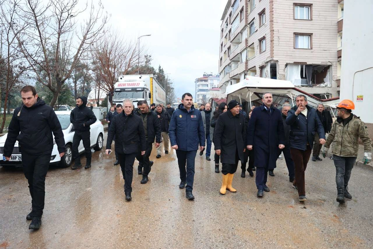 Çevre, Şehircilik ve İklim Değişikliği Bakanı Murat Kurum (önde solda 3), Gaziantep'te deprem bölgelerinde incelemede bulundu.