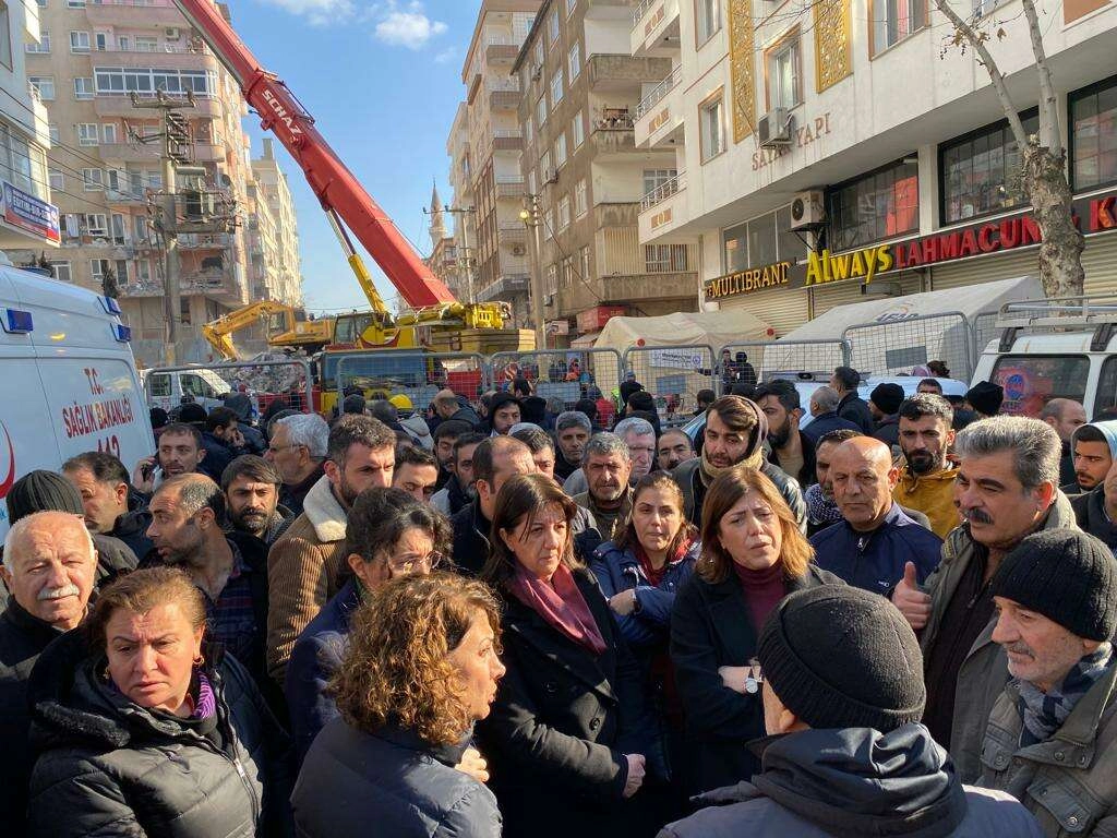 HDP Eş Genel Başkanı Pervin Buldan, Kahramanmaraş merkezli depremlerde Diyarbakır'da yıkılan binanın enkazında incelemelerde bulundu