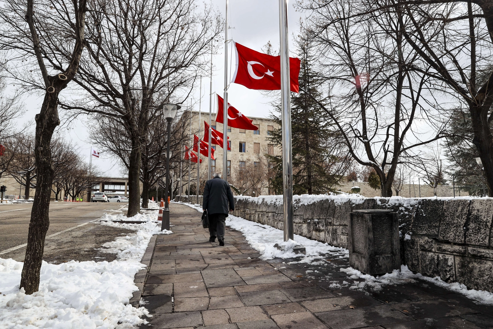 Milli yas nedeniyle TBMM binasının önündeki Türk bayrağı dışındaki bayraklar yarıya indirildi.