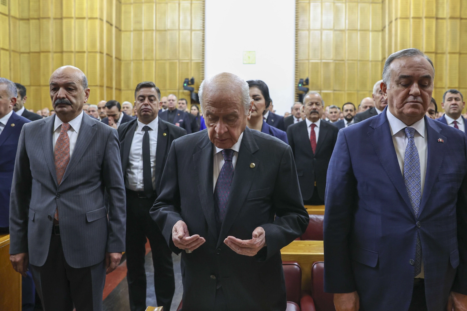 MHP Genel Başkanı Devlet Bahçeli, partisinin TBMM Grup Toplantısı'na katıldı. Toplantı başlamadan önce Bahçeli ve partililer, depremlerde hayatını kaybeden vatandaşlar için dua etti.
