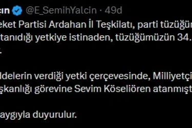 MHP'li Yalçın, sosyal medya hesabından yaptığı aynı açıklamada, Ardahan İl Başkanlığı görevine Sevim Köseliören’in atandığını açıkladı.