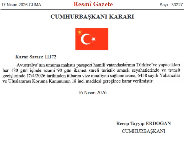 Resmi Gazete’nin bugünkü sayısında yayımlanan 11172 sayılı karar uyarınca, Avustralya Umuma Mahsus Pasaport hamili vatandaşlar, 17 Nisan 2026 tarihinden itibaren Türkiye’ye turistik amaçlı seyahatlerinde ve transit geçişlerinde her 180 gün içinde azami 90 gün vize muafiyeti elde etti.
