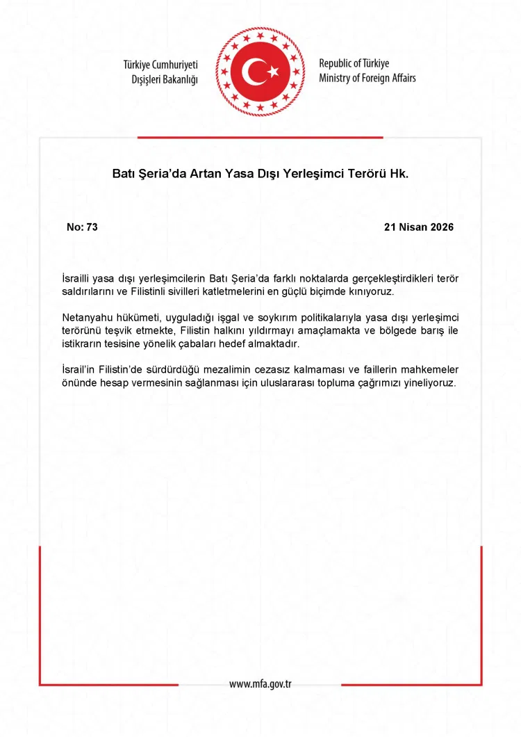 Bakanlık, İsrail hükümetinin izlediği politikaların bölgede şiddeti körüklediğini belirterek, yerleşimci saldırılarının teşvik edildiğine dikkat çekti. Açıklamada, bu yaklaşımın Filistin halkını sindirmeyi amaçladığı ve bölgede barış ile istikrarın sağlanmasına yönelik çabalara zarar verdiği vurgulandı. Uluslararası topluma da çağrıda bulunulan açıklamada, Filistin’de yaşanan ihlallerin cezasız kalmaması gerektiği belirtilerek, sorumluların yargı önünde hesap vermesinin sağlanması istendi.