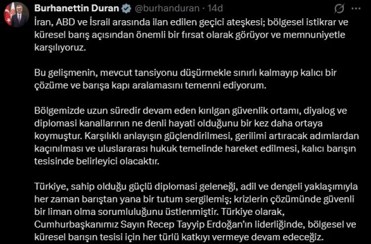 Ateşkesin yalnızca mevcut gerilimi düşürmekle sınırlı kalmaması gerektiğini vurgulayan Duran, bunun kalıcı bir çözüme ve barışa kapı aralaması temennisinde bulundu.