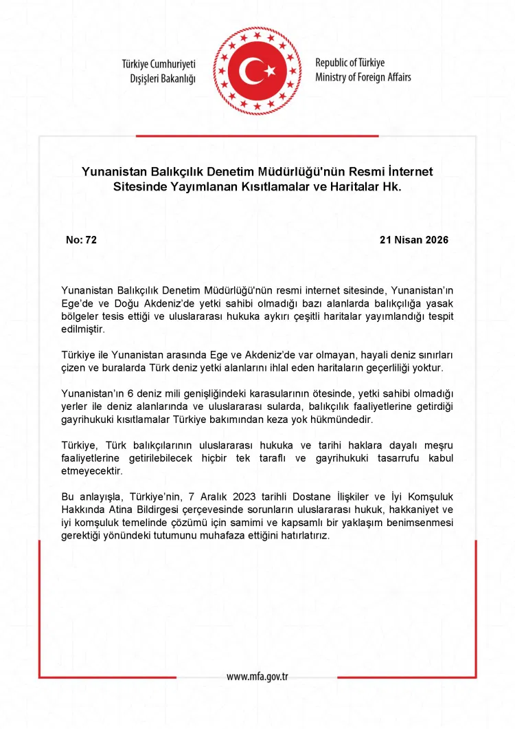 Bakanlıktan yapılan yazılı açıklamada, Yunanistan Balıkçılık Denetim Müdürlüğü’nün resmi internet sitesinde yer alan ve deniz yetki alanı dışında kalan bölgeleri de kapsayan haritaların uluslararası hukuka aykırı olduğu belirtildi. Açıklamada, Ege ve Doğu Akdeniz’de Türkiye ile Yunanistan arasında var olmayan deniz sınırlarının çizildiği ve Türk deniz yetki alanlarının ihlal edildiği ifade edilerek, bu tür girişimlerin “geçersiz ve yok hükmünde” olduğu vurgulandı.
