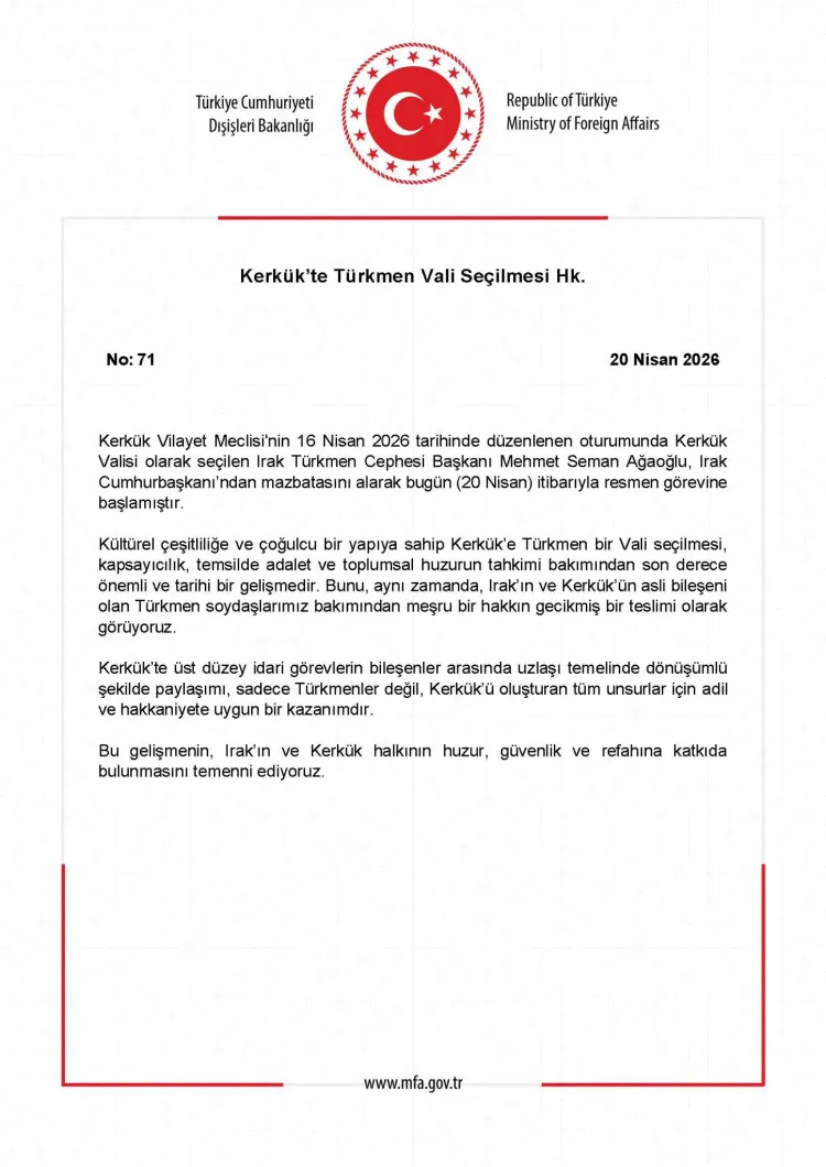 ANKARA (İGFA) - Türkiye Cumhuriyeti Dışişleri Bakanlığı, Kerkük Vilayet Meclisi’nin 16 Nisan 2026 tarihli oturumunda vali seçilen Mehmet Seman Ağaoğlu’nun göreve başlamasına ilişkin yazılı bir açıklama yaptı.