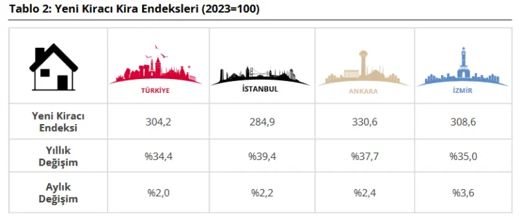 Büyükşehirlerde kira artışları İstanbul’da yüzde 39,4, Ankara’da yüzde 37,7 ve İzmir’de yüzde 35 seviyesinde gerçekleşti. Bölgesel olarak en yüksek kira artışı yüzde 40,5 ile Doğu Anadolu’daki TRB2 (Erzurum, Erzincan, Bayburt, Ağrı, Ardahan, Kars, Iğdır) bölgesinde görülürken, en düşük artış yüzde 25,7 ile TR63 (Hatay, Kahramanmaraş, Osmaniye) bölgesinde kaydedildi.