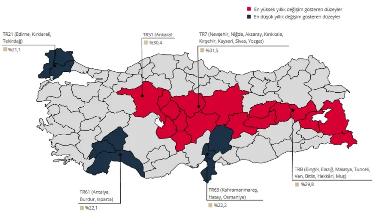 En düşük artış ise yüzde 21,1 ile TR21 (Edirne, Kırklareli, Tekirdağ) bölgesinde kaydedildi.