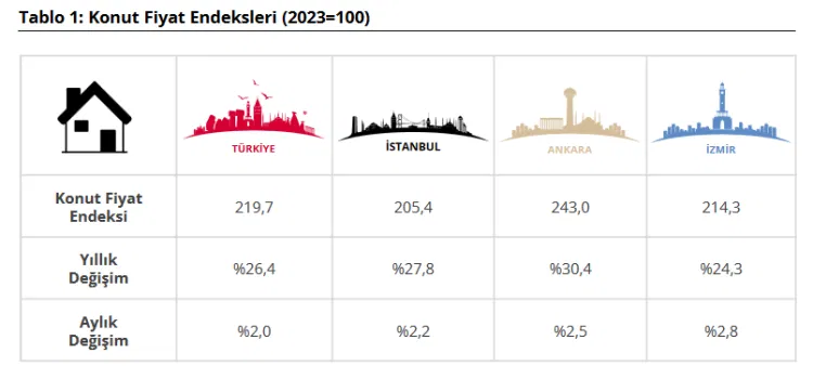 Mart ayında İstanbul’da aylık yüzde 2,2, Ankara’da yüzde 2,5 ve İzmir’de yüzde 2,8 oranında artış kaydedildi. Yıllık bazda ise İstanbul’da yüzde 27,8, Ankara’da yüzde 30,4 ve İzmir’de yüzde 24,3’lük yükseliş görüldü.