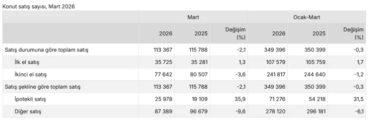 Mart ayında ilk el konut satışları geçen yılın aynı ayına göre yüzde 1,3 artarak 35 bin 725’e yükseldi. Buna karşılık ikinci el konut satışları yüzde 3,6 azalarak 77 bin 642 olarak kaydedildi. Toplam satışlar içinde ilk el konutların payı yüzde 31,5 olurken, ikinci el satışların payı yüzde 68,5 seviyesinde gerçekleşti.