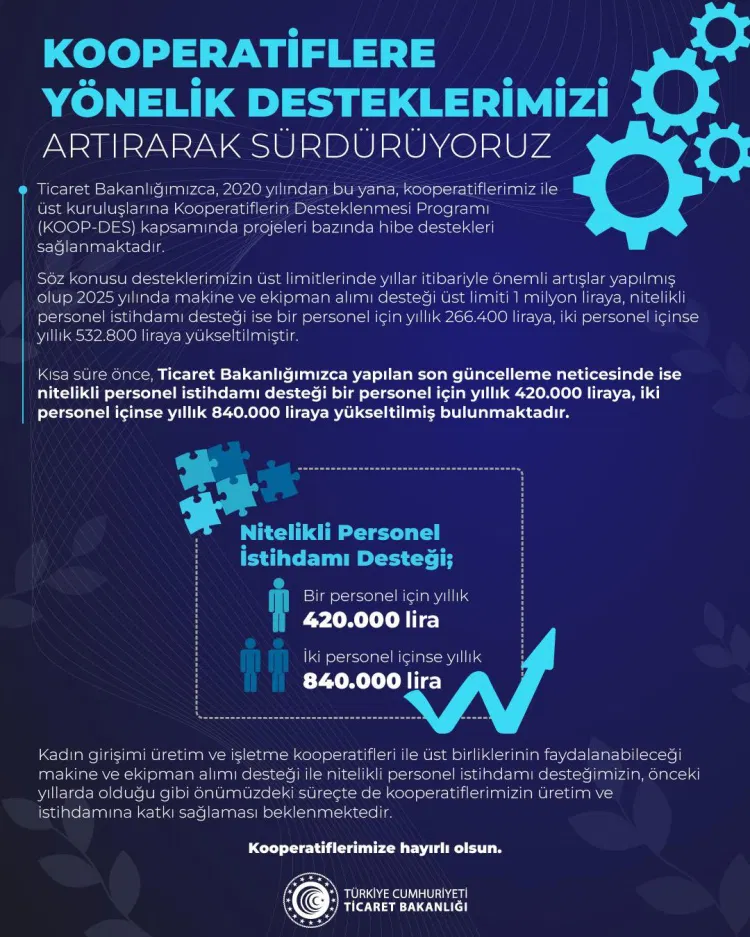Ticaret Bakanlığı, kooperatiflere yönelik destekleri artırdı. Yeni düzenlemeyle kadın kooperatiflerinde personel istihdam desteği önemli ölçüde yükseltildi. Yeni programda nitelikli personel istihdam desteği 2026 yılı itibarıyla 840 bin TL’ye yükseltildi.