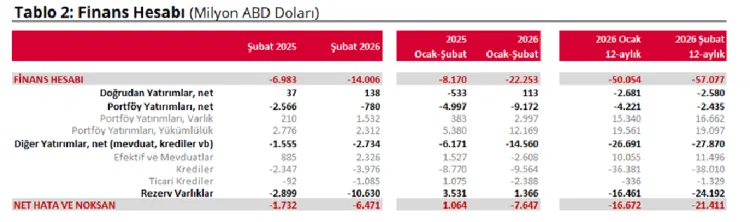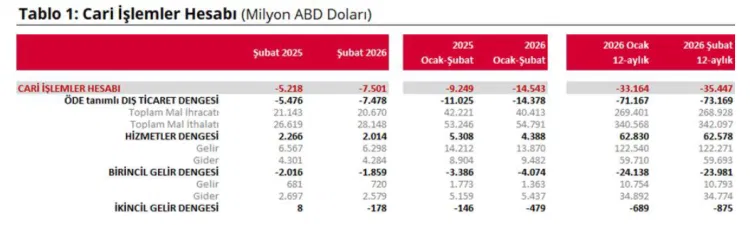 ANKARA (İGFA) - Türkiye Cumhuriyet Merkez Bankası, 2026 yılı Şubat ayına ilişkin ödemeler dengesi istatistiklerini açıkladı. Buna göre cari işlemler hesabı Şubat ayında 7 milyar 501 milyon dolar açık verdi.
