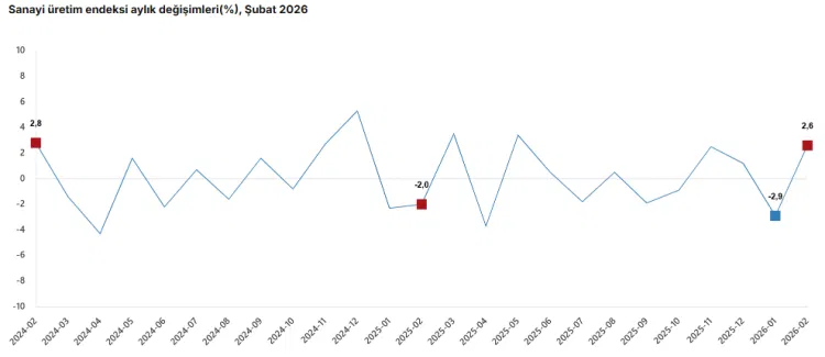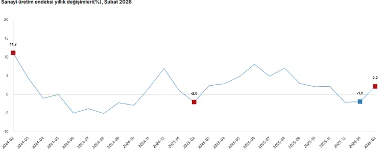 Türkiye'de sanayi üretim endeksi, 2026 yılı Şubat ayında aylık bazda yüzde 2,6, yıllık bazda yüzde 2,2 artış gösterdi.