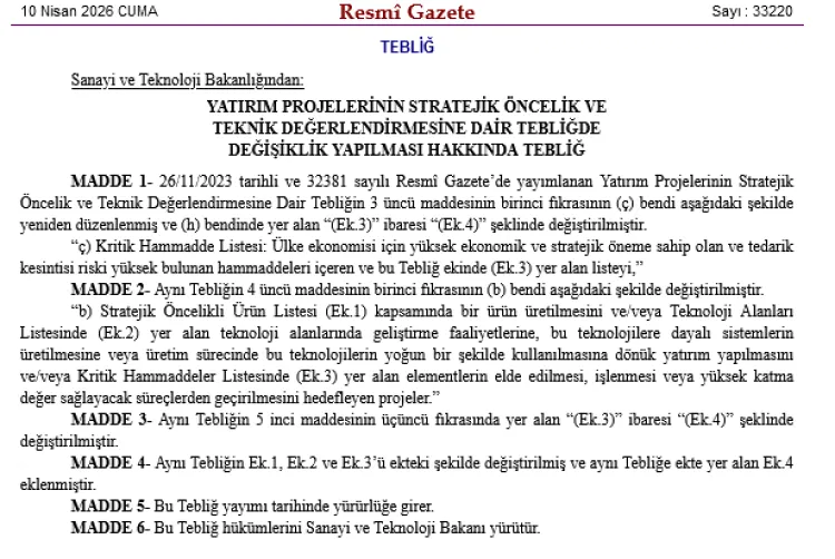 Sanayi ve Teknoloji Bakanlığı, stratejik yatırımlara yön veren tebliğde önemli değişikliklere gitti. Kritik hammaddeler listesi yeniden tanımlanırken, yatırım kapsamı genişletildi.