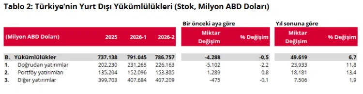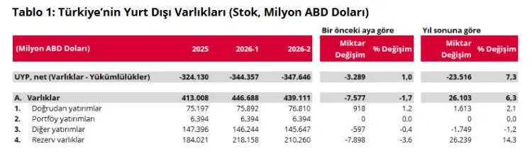 Yükümlülükler tarafında ise doğrudan yatırımlar kalemi, BIST 100’deki düşüşün etkisiyle yüzde 2,2 gerileyerek 226,2 milyar dolara düştü. Portföy yatırımları yüzde 0,8 artışla 153,4 milyar dolara yükselirken, diğer yatırımlar yüzde 0,1 azalarak 407,2 milyar dolar seviyesinde gerçekleşti.
