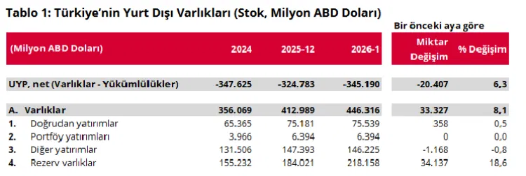 Merkez Bankası verilerine göre, Türkiye’nin Ocak 2026 itibarıyla yurt dışı varlıkları yüzde 8,1 artarken, yükümlülükleri yüzde 7,3 yükseldi.