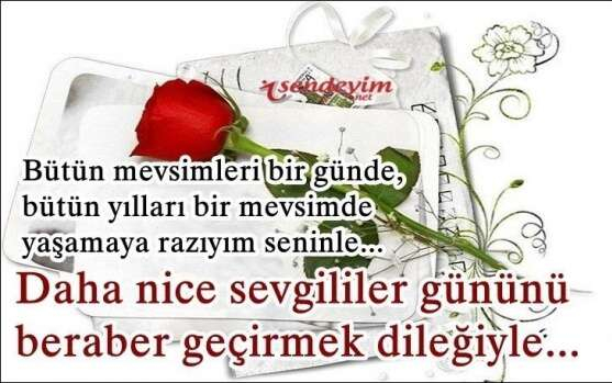 Bütün mevsimleri bir günde, bütün yılları bir mevsimde yaşamaya razıyım seninle… Daha nice sevgililer gününü beraber geçirmek dileğiyle.