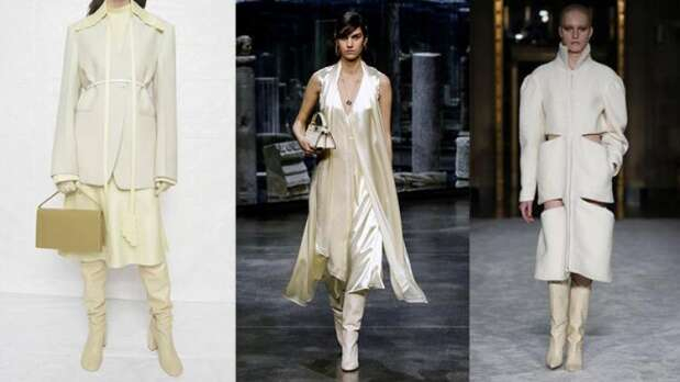 Bu sezonun en zengin görünümlü ayakkabıları elbette krem rengi ayakkabılar. Özellikle birbirine yakın tonlarda parçalarla birleştirdiğinizde lüks bir görüntü yaratmanız kaçınılmaz. - Fotoğraf: Jil Sander, Fendi, Christian Siriano