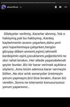 Alişan da şu sözlerle sessizliğini bozdu; "Dilekçeler verilmiş. Kararlar alınmış. Yok o haklıymış, yok bu haklıymış. Kardeş kaybetmenin acısını yaşarken, daha yeni yeni toparlanmaya çalışırken, her gün gözyaşı döken annemi, eşimi, rahmetli kardeşimin eşini, çocuklarımı, yeğenlerimi ne olur rahat bırakın. Her ailede yaşanabilecek şeyler bunlar. Biz bir karar verirsek açıklarız söyleriz. Ama bizim adımıza karar vermeyin lütfen. Ne olur artık senaryolar üretmeyin yorum yapmayın, bizi bize bırakın. Kararı biz verelim. Sonra ne isterseniz konuşursunuz yorum yaparsınız" ifadelerini kullandı.