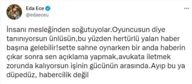 "İNSANI MESLEĞİNDEN SOĞUTUYORLAR" "İnsanı mesleğinden soğutuyorlar. Oyuncusun diye tanınıyorsun ünlüsün, bu yüzden her türlü yalan haber başına gelebilir! Sette sahne oynarken bir anda haberin çıkar... Sonra sen açıklama yapmak, avukata iletmek zorunda kalıyorsun işinin gücünün arasında."