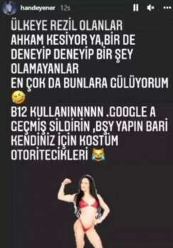 "GOOGLE’A GEÇMİŞ SİLDİRİN" Yıldızhan'ın açıklamasından sonra Hande Yener, "Ülkeye rezil olanlar ahkam kesiyor ya, bir de deneyip deneyip bir şey olamayanlar... En çok da bunlara gülüyorum. B12 kullanın, Google'a geçmiş sildirin. Bir şey yapın bari kendiniz için kostüm otoritecikleri" mesajını yazarak gündeme gelmişti.