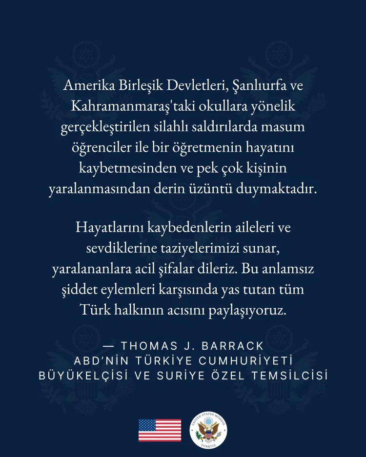 ABD Türkiye Cumhuriyet Büyükelçisi Thomas J. Barrack, Şanlıurfa ve Kahramanmaraş’taki okul saldırılarında hayatını kaybedenler için taziye mesajı yayımladı.