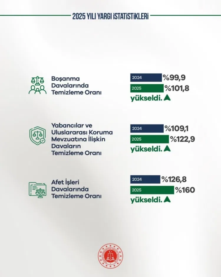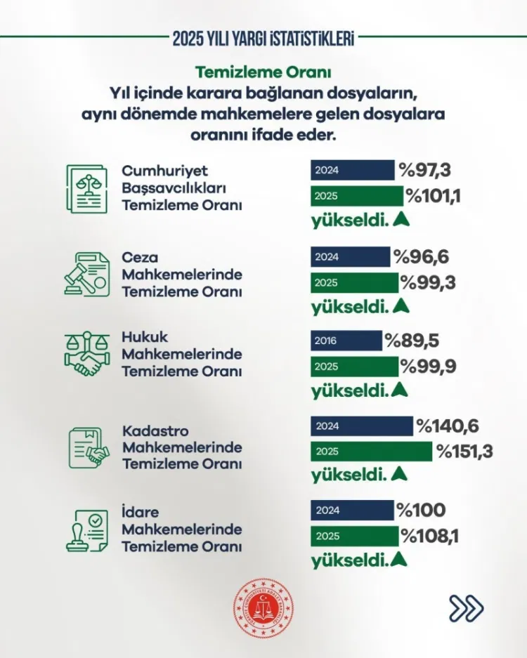 2025 yılında hukuk mahkemelerinde temizleme oranı yüzde 99,9’a, ceza mahkemelerinde yüzde 99,3’e yükseldi. Kadastro mahkemelerinde ise yüzde 151,3’e ulaşan oran, açılan dosyalardan daha fazlasının karara bağlandığını gösterdi.