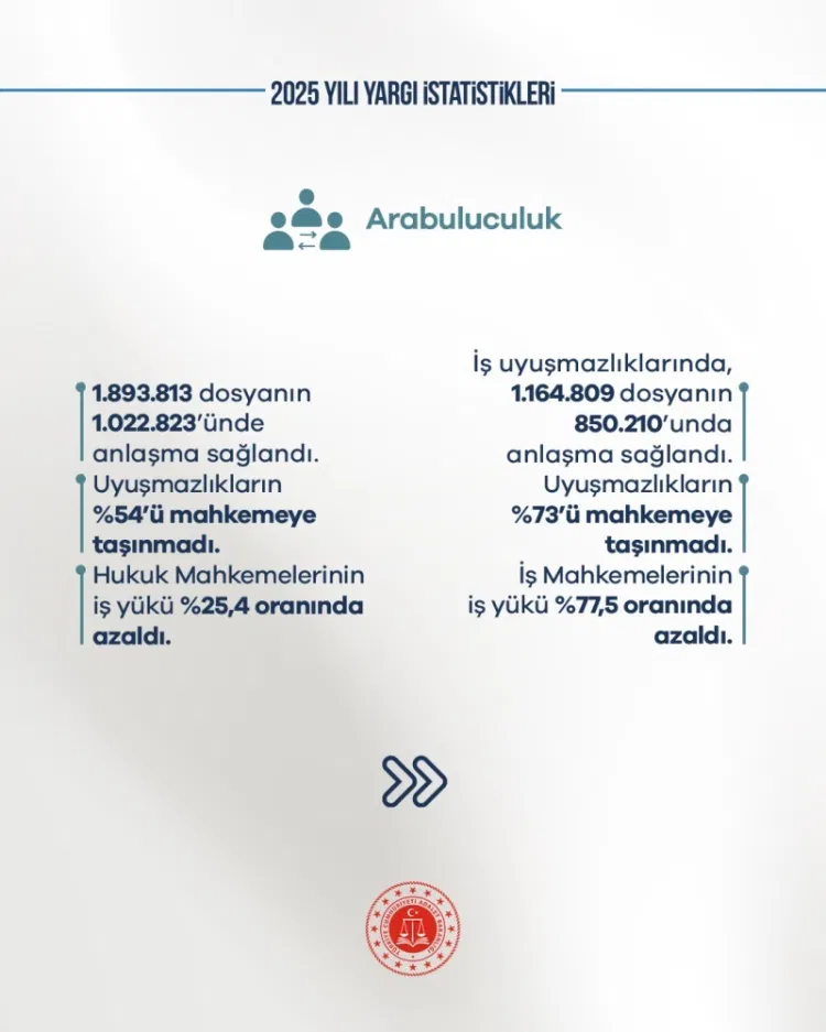 Adalet Bakanlığı, 2025 yılı adalet istatistiklerinin yargı süreçlerinde hızlanma, iş yükünde azalma ve alternatif çözüm yöntemlerinde artışı ortaya koyduğunu rakamlarla açıkladı.