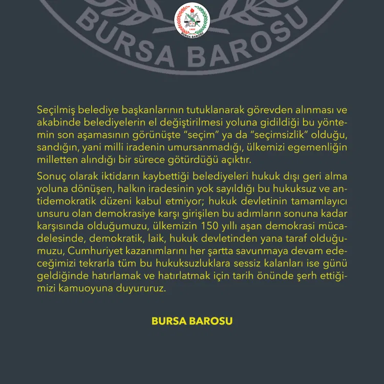 Bursa Barosu, bu uygulamaların hukuk devleti ilkesine zarar verdiğini ve demokratik düzeni tehdit ettiğini belirterek, halkın iradesinin yok sayıldığı bir sürecin kabul edilemeyeceğini vurguladı.