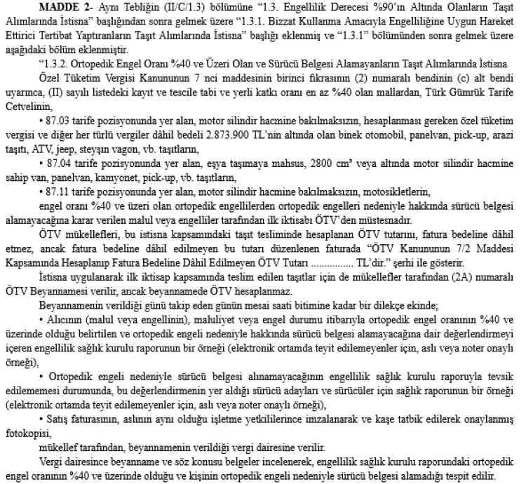 Yeni düzenlemeyle, özellikle engelli vatandaşların taşıt alımlarına ilişkin ÖTV istisnasının kapsamı genişletildi ve uygulamaya açıklık getirildi.