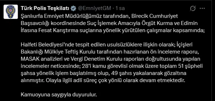 Şanlıurfa’da Halfeti Belediyesi’ndeki usulsüzlük iddialarına yönelik yürütülen soruşturmada, 28’i kamu görevlisi olmak üzere 51 şüpheli hakkında işlem başlatıldı, 49 kişi gözaltına alındı.