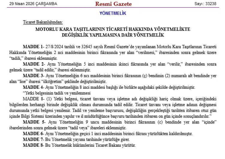 Ticaret Bakanlığı, motorlu kara taşıtı ticaretine ilişkin yönetmelikte değişikliğe gitti; yetki belgelerinde “tadil” süreci tanımlanırken eğitim şartı da liseden ilköğretime çekilerek esnetildi.