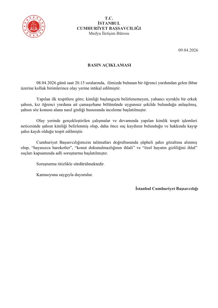 Edinilen bilgilere göre, 8 Nisan 2026 günü saat 20.15 sıralarında yurttan gelen ihbar üzerine ekipler hızla olay yerine intikal etti. Yapılan ilk incelemelerde, kimliği başlangıçta belirlenemeyen bir erkek şahsın, kız öğrenci yurduna ait çamaşırhane bölümünde uygunsuz şekilde bulunduğu tespit edildi. Şahsın söz konusu alana nasıl girdiğine ilişkin detaylı inceleme başlatıldı.