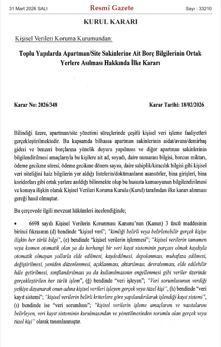 31 Mart 2026 tarihli Resmî Gazete’de yayımlanan KVKK’nın 2026/348 sayılı kararı ile ilgili düzenleme, kişisel verilerin korunmasına ilişkin uygulamalarda önemli bir netlik sağladı. Karar, özellikle site yönetimleri, apartman yöneticileri ve benzeri idari yapıların sıklıkla başvurduğu “ifşa yoluyla tahsilat” yöntemini açık biçimde hukuka aykırı kapsamına aldı.