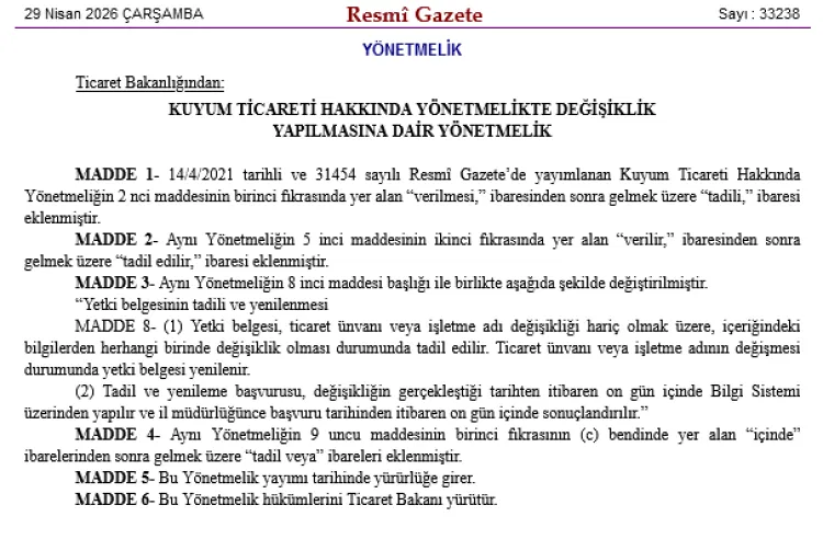 Ticaret Bakanlığı tarafından yapılan düzenlemeyle kuyum ticaretine ilişkin yetki belgelerinde değişiklik, yenileme ve başvuru süreçleri yeniden tanımlandı.
