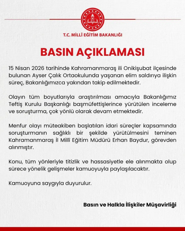 ANKARA (İGFA) - Milli Eğitim Bakanlığı, 15 Nisan 2026’da Kahramanmaraş’ın Onikişubat ilçesindeki Ayser Çalık Ortaokulu’nda yaşanan saldırıya ilişkin açıklama yaptı. Bakanlık, olayın tüm boyutlarıyla incelenmesi için Teftiş Kurulu Başkanlığı başmüfettişleri tarafından çok yönlü bir soruşturma yürütüldüğünü bildirdi.