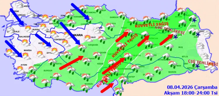 Genellikle yağmur ve sağanak, Batı ve Doğu Karadeniz’in iç kesimlerinin yüksekleri ile Doğu Anadolu’nun yükseklerinde karla karışık yağmur ve yer yer kar şeklinde görülecek olan yağışların; Doğu Akdeniz, Doğu Karadeniz, Doğu Anadolu'nun kuzeyi ile Kayseri, Sivas, Malatya, Muş ve Bingöl çevrelerinde yerel kuvvetli olması bekleniyor.