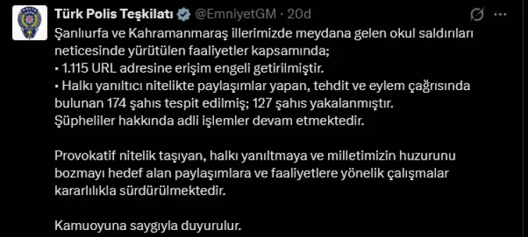 Açıklamada, halkı yanıltıcı bilgi yayan, tehdit içeren ve eylem çağrısında bulunan 174 kişinin tespit edildiği, bu kişilerden 127’sinin yakalanarak haklarında adli işlem başlatıldığı belirtildi. Diğer şüphelilerin yakalanmasına yönelik çalışmaların sürdüğü ifade edildi. Yetkililer, kamu düzenini bozmayı amaçlayan provokatif paylaşımlara karşı mücadelenin kararlılıkla devam edeceğini vurguladı.