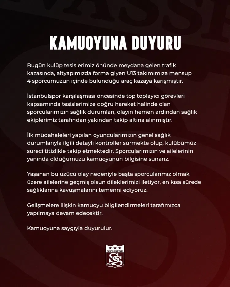 Kulüp tesisleri önünde yaşanan trafik kazasına ilişkin yazılı bir açıklama yapan kulüp yönetimi, Sivasspor U13 Takımı’nda forma giyen 4 sporcunun içinde bulunduğu aracın kaza yaptığı belirtildi. Sporcuların, İstanbulspor karşılaşması öncesinde top toplayıcı görevleri kapsamında tesislere gitmek üzere yolda oldukları ifade edildi. Kaza sonrası sporcuların sağlık durumlarının kulüp sağlık ekipleri tarafından yakından takip altına alındığı aktarıldı.