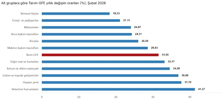 TÜİK verilerine göre Tarımsal Girdi Fiyat Endeksi Şubat’ta aylık yüzde 3,10, yıllık yüzde 31,55 artış gösterdi. En yüksek artış veteriner harcamalarında kaydedildi.