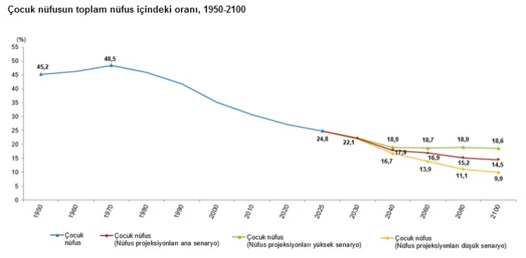 Uzun yıllara yayılan verilere göre çocuk nüfus oranındaki düşüş dikkat çekti. 1970’te yüzde 48,5 olan oran, 1990’da yüzde 41,8’e, 2025’te ise yüzde 24,8’e geriledi. Nüfus projeksiyonlarına göre bu oranın 2100 yılına kadar yüzde 14-18 bandına kadar düşmesi öngörülüyor.