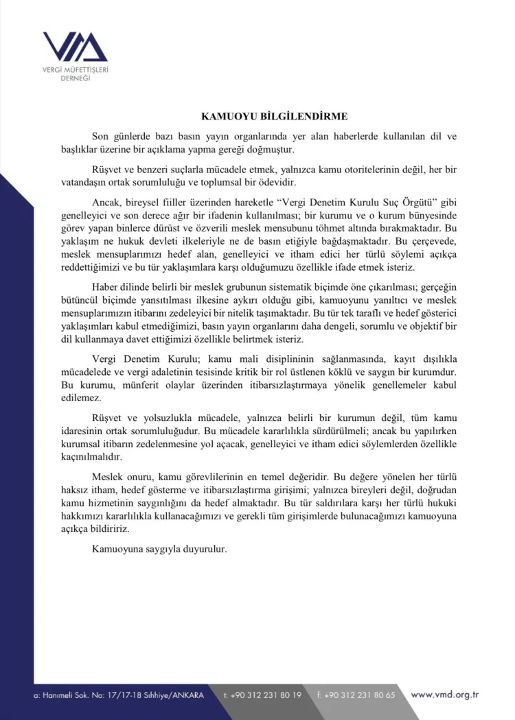 ANKARA (İGFA) - Vergi Müfettişleri Derneği, son günlerde bazı medya organlarında yer alan haberlerde kullanılan dil ve başlıklara ilişkin yazılı bir açıklama yayımladı. Açıklamada, bireysel suç iddialarından hareketle Vergi Denetim Kurulu’nun hedef alınmasının kabul edilemez olduğu vurgulandı.