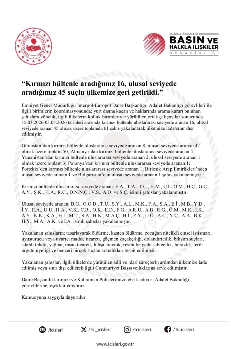 İçişleri Bakanlığı, kırmızı bülten ve ulusal düzeyde aranan toplam 61 kişinin uluslararası operasyonlarla yakalanarak Türkiye’ye iade edildiğini açıkladı.