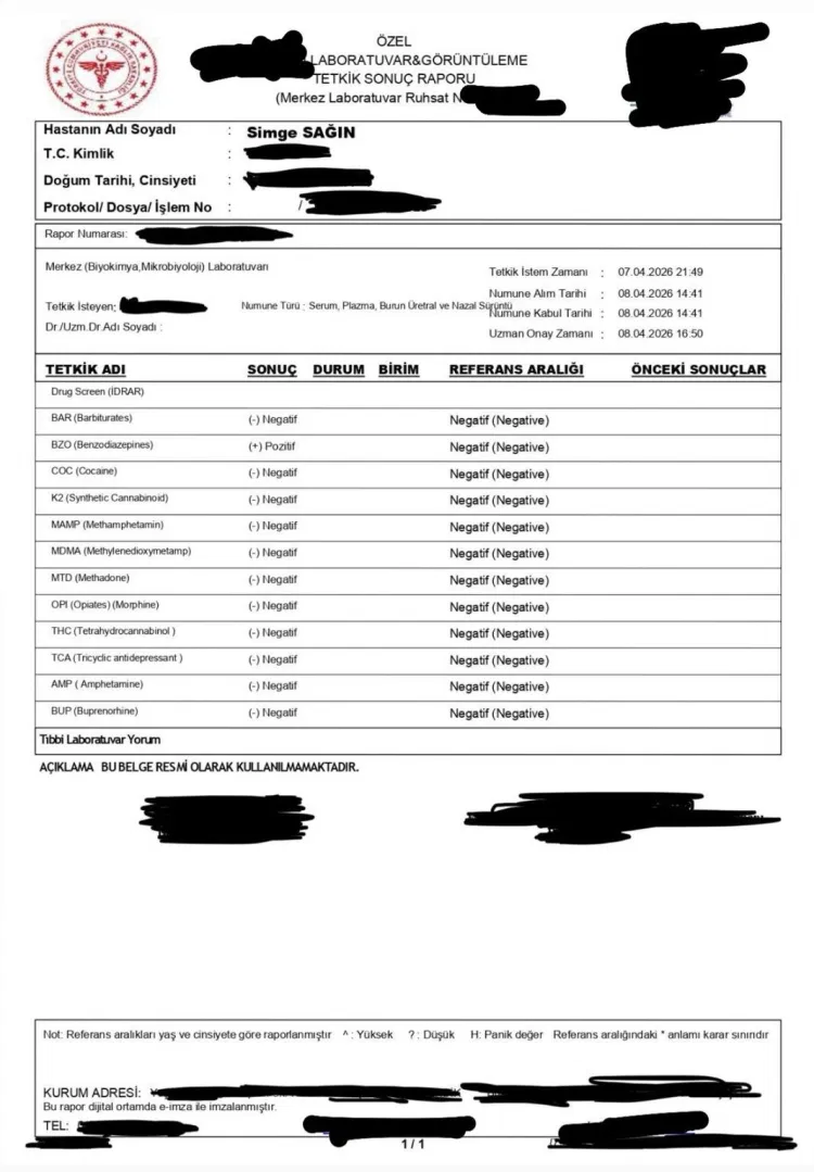 Simge Sağın hakkında yürütülen soruşturma kapsamında önemli bir gelişme yaşandı. Sanatçının avukatı müvekkilinin özel laboratuvarda yaptırdığı testlere ilişkin sonucu paylaşarak, idrar testinde herhangi bir yasaklı maddeye rastlanmadığını duyurdu.