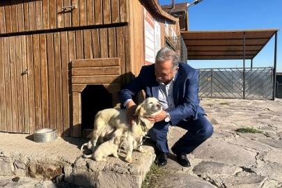 Sevimli pati Nazlı ve altı yavrusunu ziyaret eden Talas Belediye Başkanı Mustafa Yalçın, onları kucağına alarak sevdi.