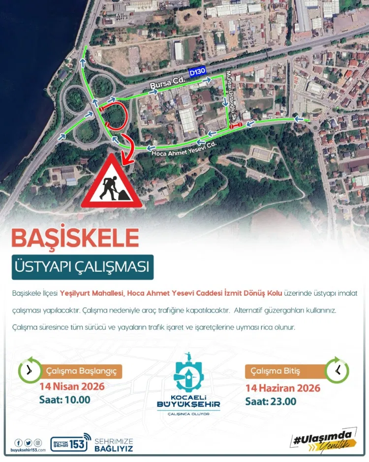 Kocaeli Büyükşehir Belediyesi, trafiğe nefes aldıracak Başiskele Kavşağı Projesi’nde önemli bir aşamaya daha geçiyor. Proje kapsamında “İzmit Sahil Bağlantı Yolu” 14 Nisan Salı (yarın) günü itibariyle trafiğe kapatılacak, çalışmalar daha da hız kazanacak.